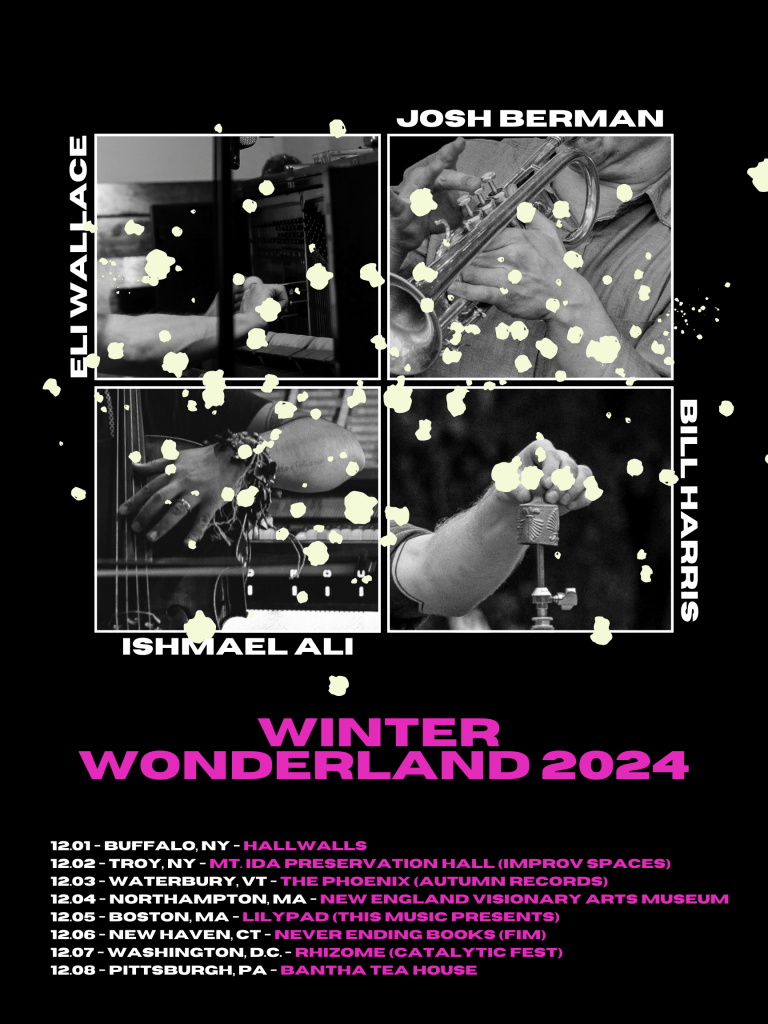 Just one week away! Dec. 2nd Monday 7:30pm at Mount Ida Preservation Hall in Troy, Improv Spaces is thrilled to be presenting Brooklyn- and Chicago-based musicians Eli Wallace, piano; Bill Harris, drums; Josh Berman, trumpet; and Ishmael Ali, cello, playing from their new album An Ill-Fitting Garment. The evening will open with a special performance by Albany-based percussionist Matt Weston.