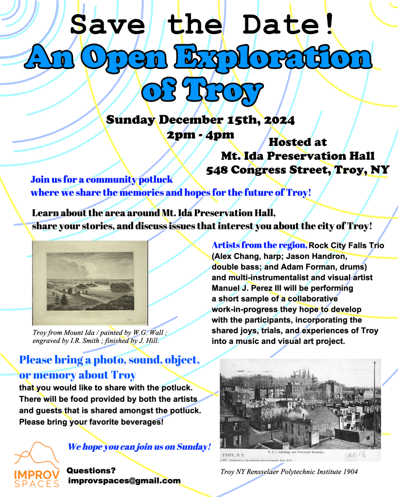 This Sunday, December 15th 2-4pm, the public is invited to bring their personal photos, sounds, objects and memories about the city to share at a community potluck at Mt. Ida Preservation Hall in Troy. The artists hope to incorporate our collective joys, trials, and experiences of the city into a music and visual art project.