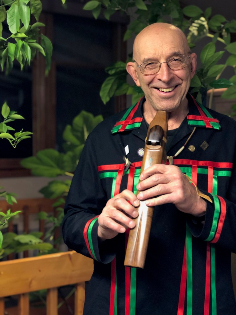 As a musician, he has focused on traditional Northeastern Native music and the ballads of the days of logging in the Adirondack region, as well as composing his own songs. For a number of years he, his sister Marge, and his two grown sons Jesse and James performed together as the Dawn Land Singers and released two CDs of original and traditional Abenaki music: ALNOBAK and HONOR SONGS/ GWISINTOW8GANAL. An accomplished Native flute player and drummer, he has been featured as a musician at schools, festivals and other venues throughout the United States including the Champlain Valley Festival, Abenaki Cultural Heritage Days, the Old Songs Festival, The Flurry, The Clearwater’s Great Hudson River Revival Festival, the Corn Island Festival, the National Storytelling Festival, The Eighth Step, the Kanatsiohareke Strawberry Festival, the Sierra Storytelling Festival, and Caffe Lena.