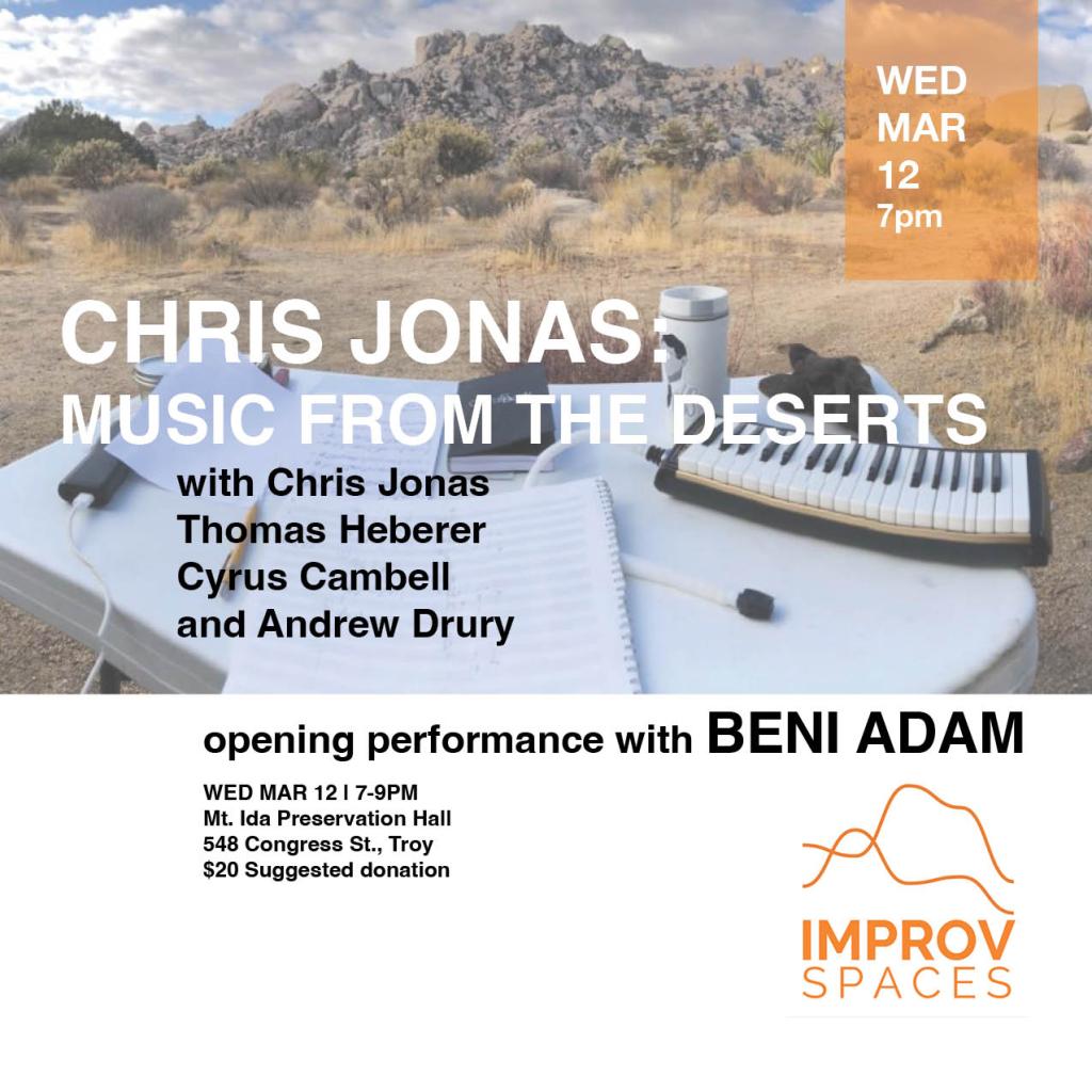 Improv Spaces is thrilled to announce a special evening of improvisational music at Mt. Ida Preservation Hall on Wednesday, March 12, 2025 of Chris Jonas: Music from the Deserts with Chris Jonas, compositions, projected video, soprano and tenor saxophones; Thomas Heberer, cornet; Cyrus Campbell, acoustic bass; Andrew Drury, drums. Local Troy-based Beni Adam, the team of multi-talented improvisational musicians Adam Tinkle and Adam Elabd, will debut their acoustic and electric clarinet duo to open the evening.