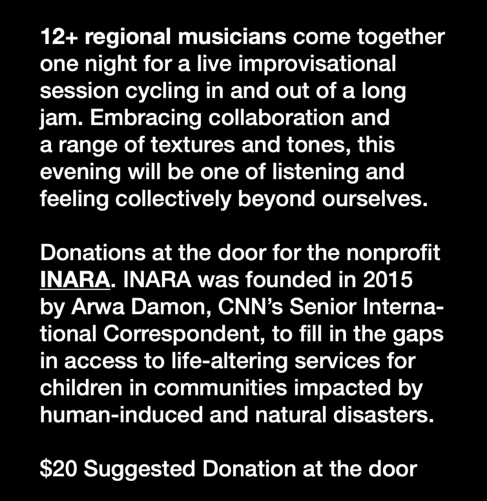 We bring together and develop performance programs with musicians and artists for high caliber collaborations including on experimental collaborations, working with emerging improv-based composers on performing their compositions, and by providing space for improv sessions practice on a regular basis for area musicians to develop the community and their collaborative projects including through workshops and feedback.