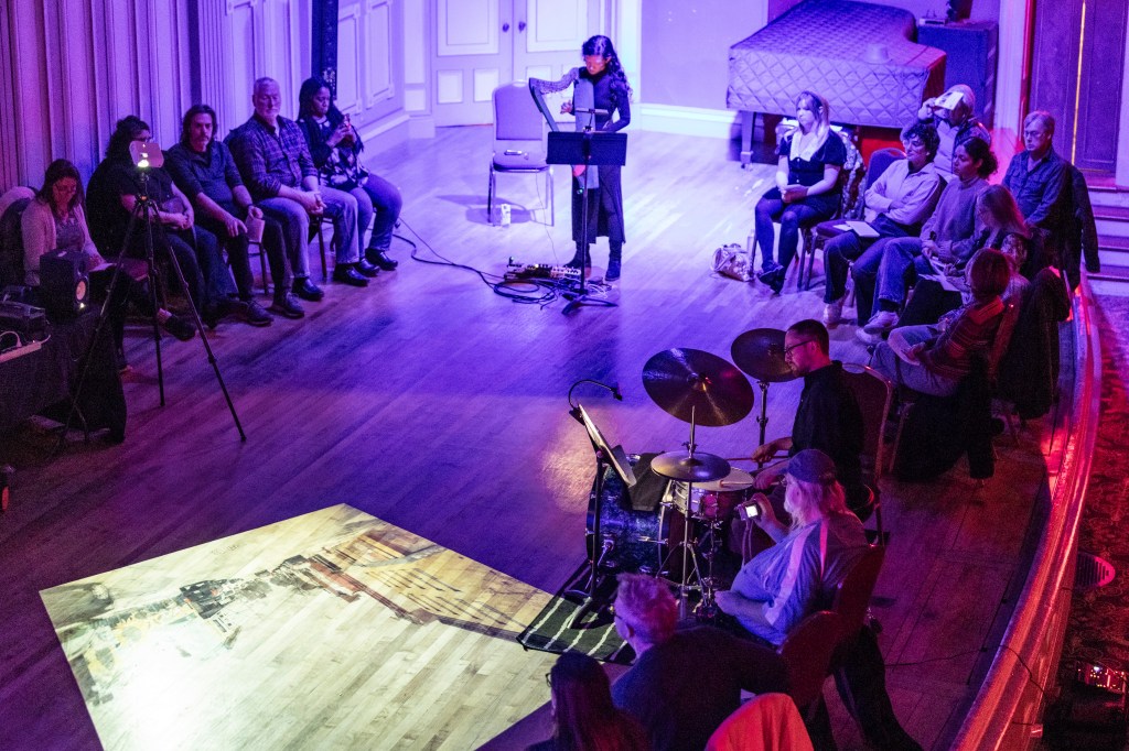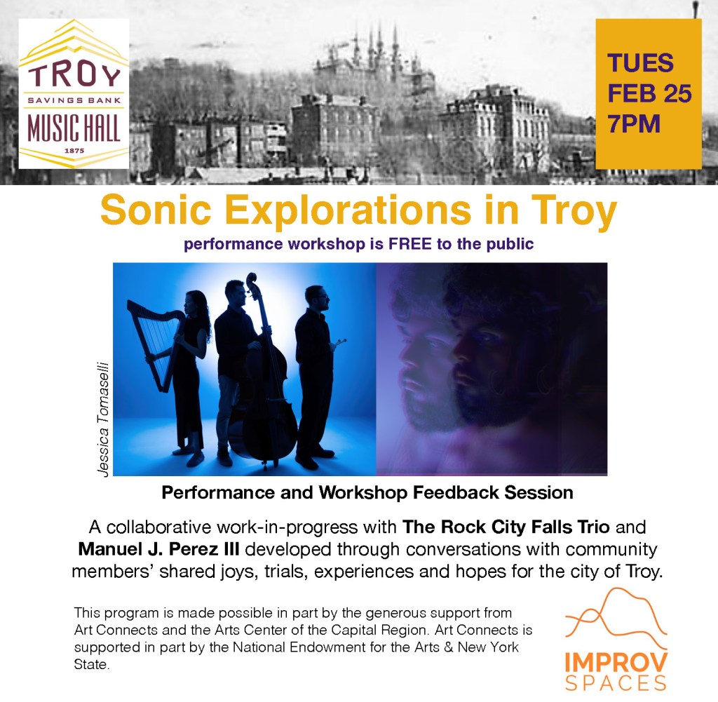 The premier of the Rock City Falls Trio (Alex Chang, harp; Jason Handron, bass; Adam Forman, drums) and artist/multi-instrumentalist Manuel J. Perez III collaborative incubator project with Improv Spaces artist-in-residence at the Troy Savings Bank Music Hall